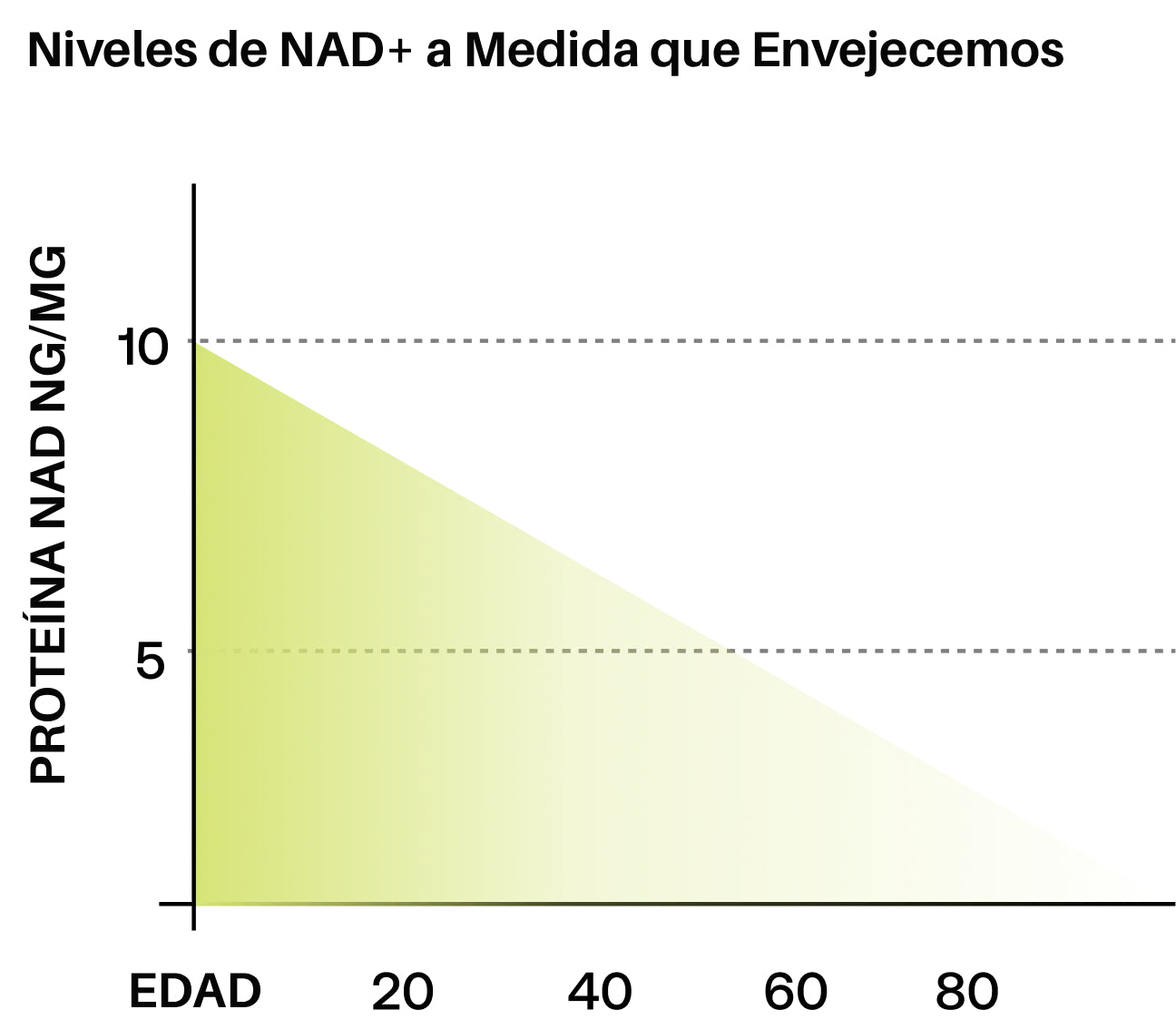 Sin embargo, a pesar de su importancia, los niveles de NAD+ en nuestro organismo disminuyen gradualmente con la edad. Esta disminución afecta a diversos tejidos, como el hígado, la piel, el cerebro y los músculos, lo que provoca un envejecimiento acelerado y enfermedades relacionadas con la edad.